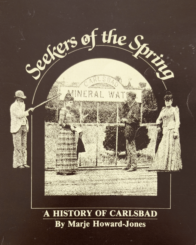 "Seekers of the Spring: A History of Carlsbad," by Marje Howard-Jones, 1982, published by The Friends of the Carlsbad Library. Illustrated with over 200 photographs, many from private collections, the book begins with the first fishermen of Agua Hedionda lagoon -- the indigenous tribes who welcomed the Franciscans on their trek north.